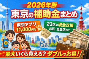 - 【2026年最新版】東京都+23区の補助金まとめ|最大いくら貰える?東京アプリ1.1万円も徹底解説