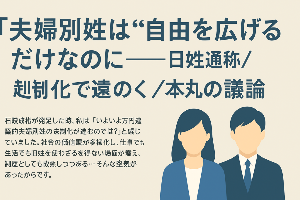 石破政権が発足した時、私は「いよいよ選択的夫婦別姓の法制化が進むのでは?」と感じていました。社会の価値観が多様化し、仕事でも生活でも旧姓を使わざるを得ない場面が増え、制度としても成熟しつつある…そんな空気があったからです。