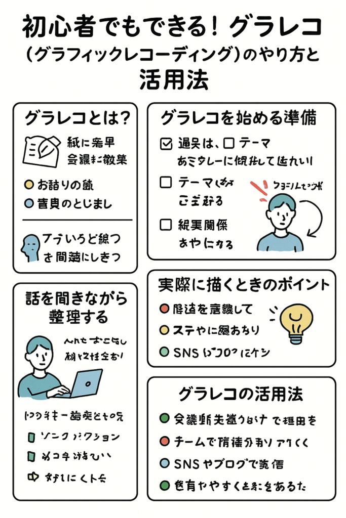 最近、会議やセミナーの現場で注目されている グラレコ(グラフィックレコーディング)。文字だけでは伝わりにくい情報を、イラストや図解で整理して記録する手法です。