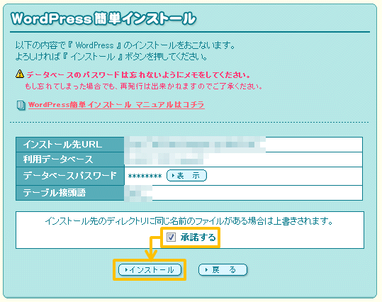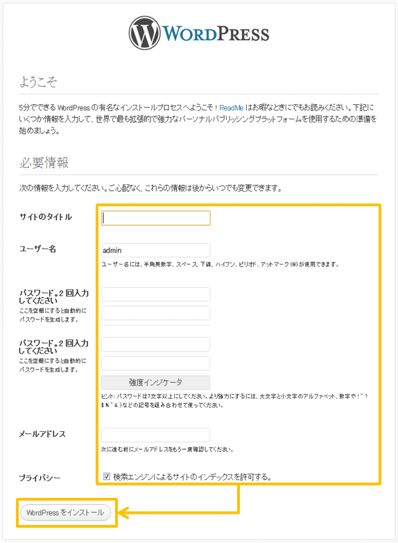 8.必要事項を入力して、「WordPressをインストール」をクリックします。