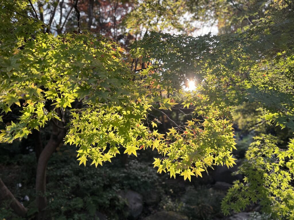 帰り際、ふと振り返ると、少しずつ夕暮れに染まり始めた園内が見えました。昼間とはまた違った表情を見せる紅葉は、しっとりとした深い色合いに変わり、一日の締めくくりとしては最高の景色でした。