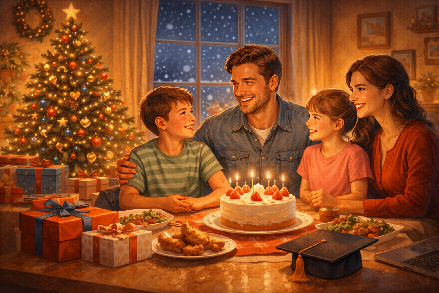 仕事を終えて家に戻ると、ツリーはすでに飾られ、ケーキも冷蔵庫で出番を待ち、子どもたちはどこか落ち着かない様子で夜を待っています。